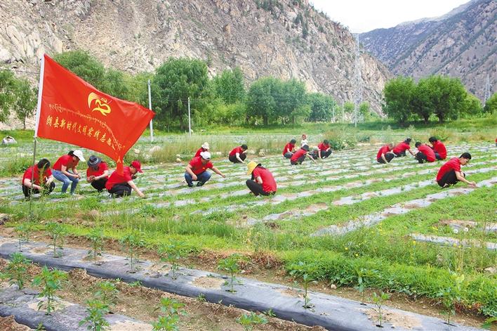 圖為西藏自治區(qū)林芝市朗縣新時代文明實(shí)踐志愿服務(wù)隊來到洞嘎鎮(zhèn)達(dá)木村,幫助當(dāng)?shù)卮迕窀赊r(nóng)活。