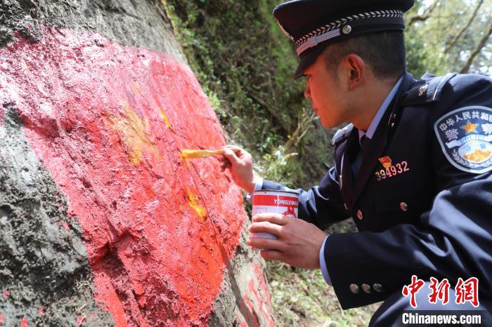 圖為玉麥邊境派出所移民管理警察在邊境一線對國旗、中國字樣等主權(quán)標志物描紅。山南邊境管理支隊供圖
