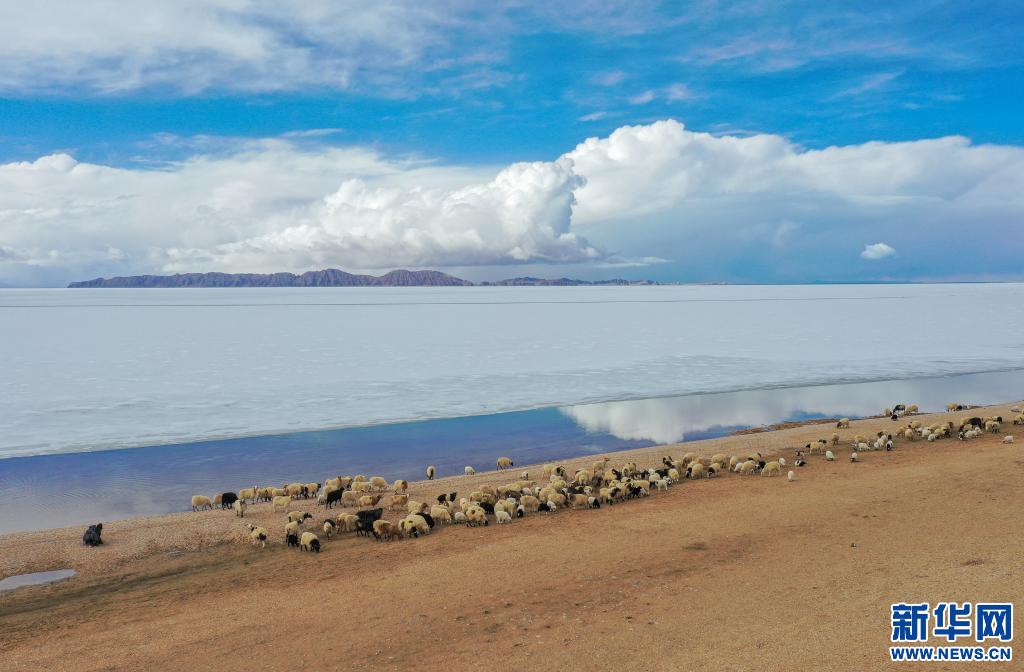 牧民指揮羊群從色林錯經(jīng)過(2020年4月29日無人機攝)。 新華社記者田金文 攝