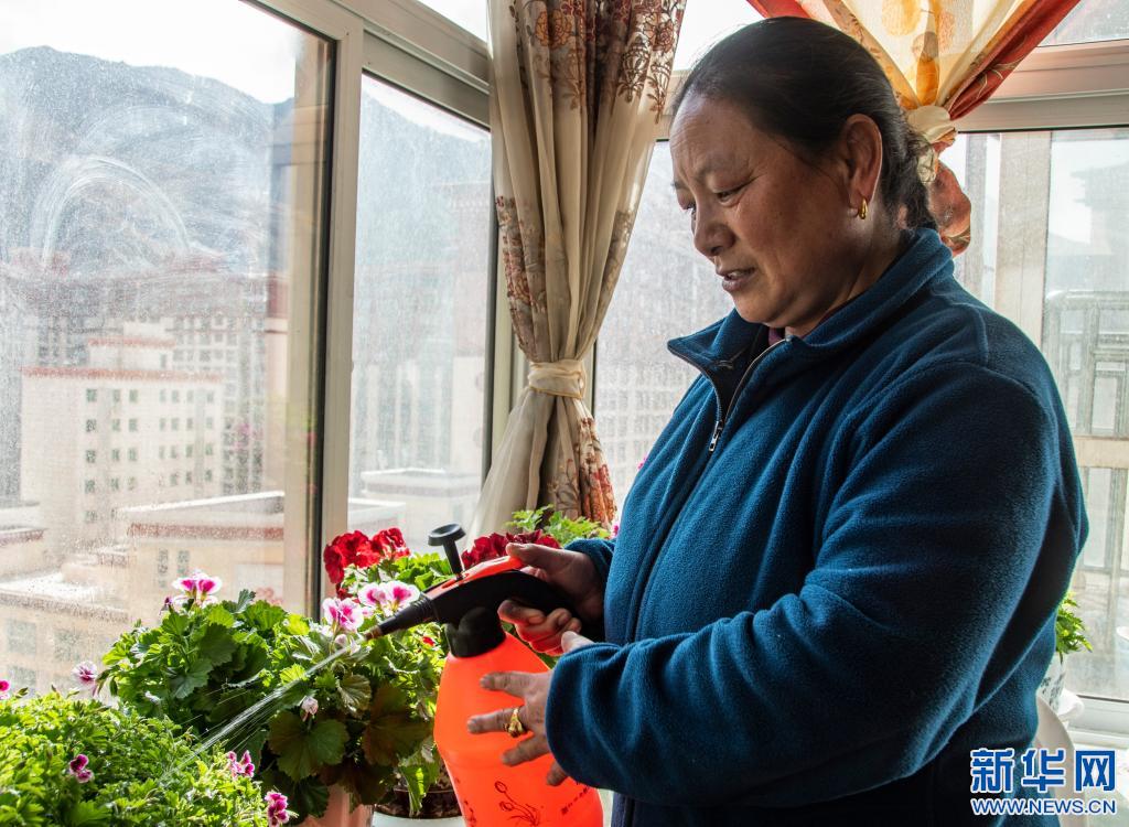 昌都市卡若區(qū)城關(guān)鎮(zhèn)居民永西在新家中給花草澆水(3月25日攝)。新華社記者 陳尚才 攝