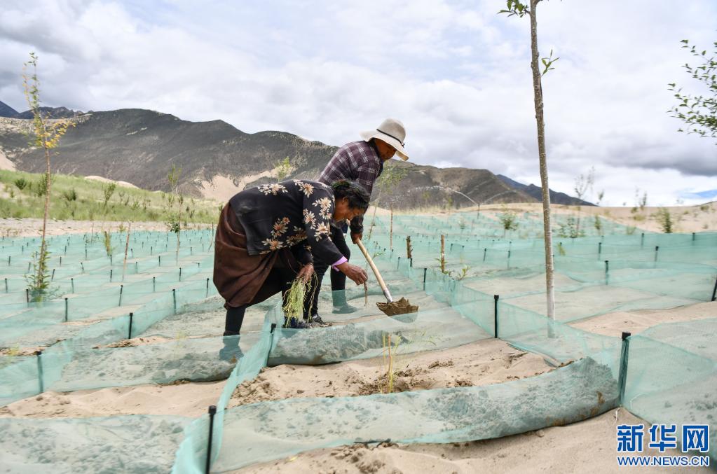 在山南市全國(guó)防沙治沙綜合示范區(qū),當(dāng)?shù)厝罕娫谏车厣显苑N樹苗(7月20日攝)。新華社記者 晉美多吉 攝