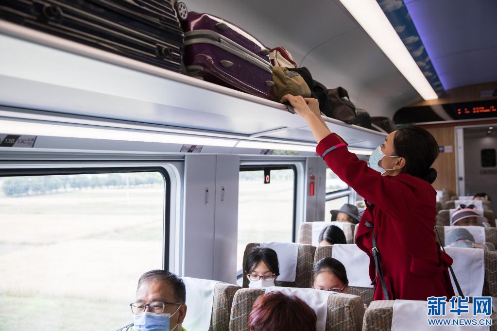 在從拉薩開往林芝的列車上,列車乘務(wù)員在整理貨架上的行李(7月26日攝)。新華社記者 金立旺 攝
