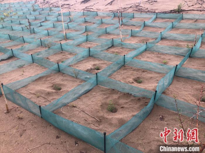 “傳統(tǒng)的方法是用廢樹枝等擺成方格等一定的形狀壓沙,里面再種上植物,效果很好但樹枝往往四五年就腐爛了;最近我們在嘗試推廣一種新型化學(xué)材料方格,成規(guī)???,且能維持七到十年?!敝袊茖W(xué)院西北生態(tài)資源研究院研究員常學(xué)向?qū)τ浾哒f。