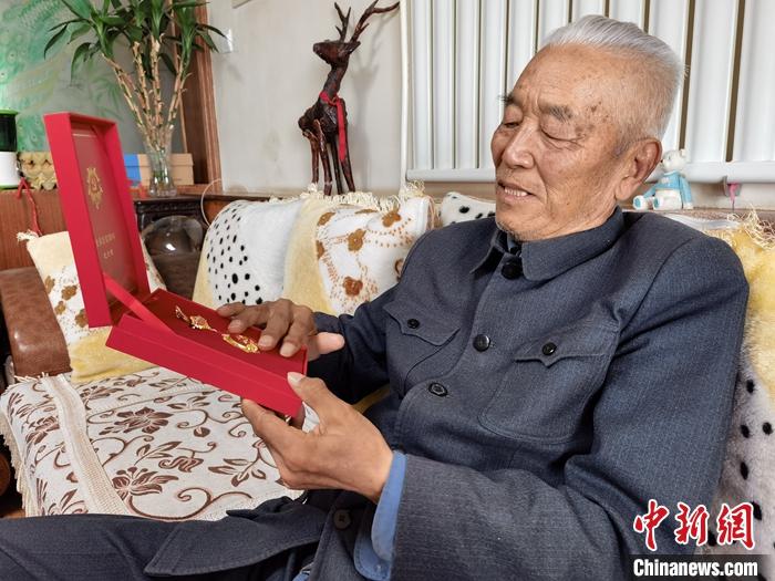 資料圖為7月27日,西藏運輸總隊成立后第一批進藏的駝工李興仁向記者展示自己獲得的“光榮在黨50年紀念章”。 中新社記者 祁增蓓 攝