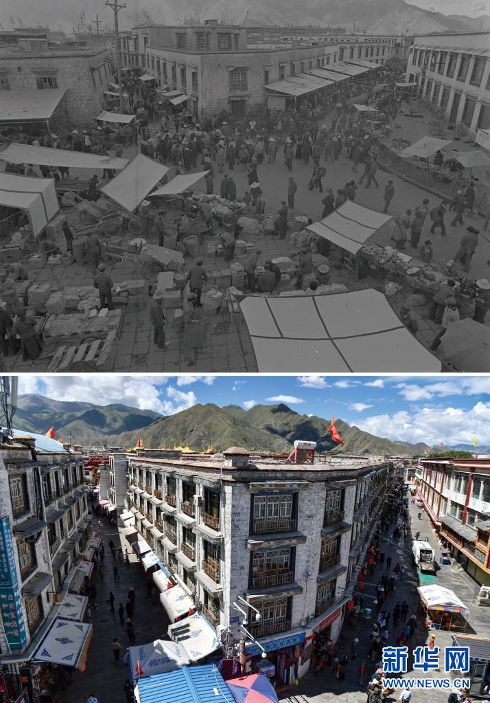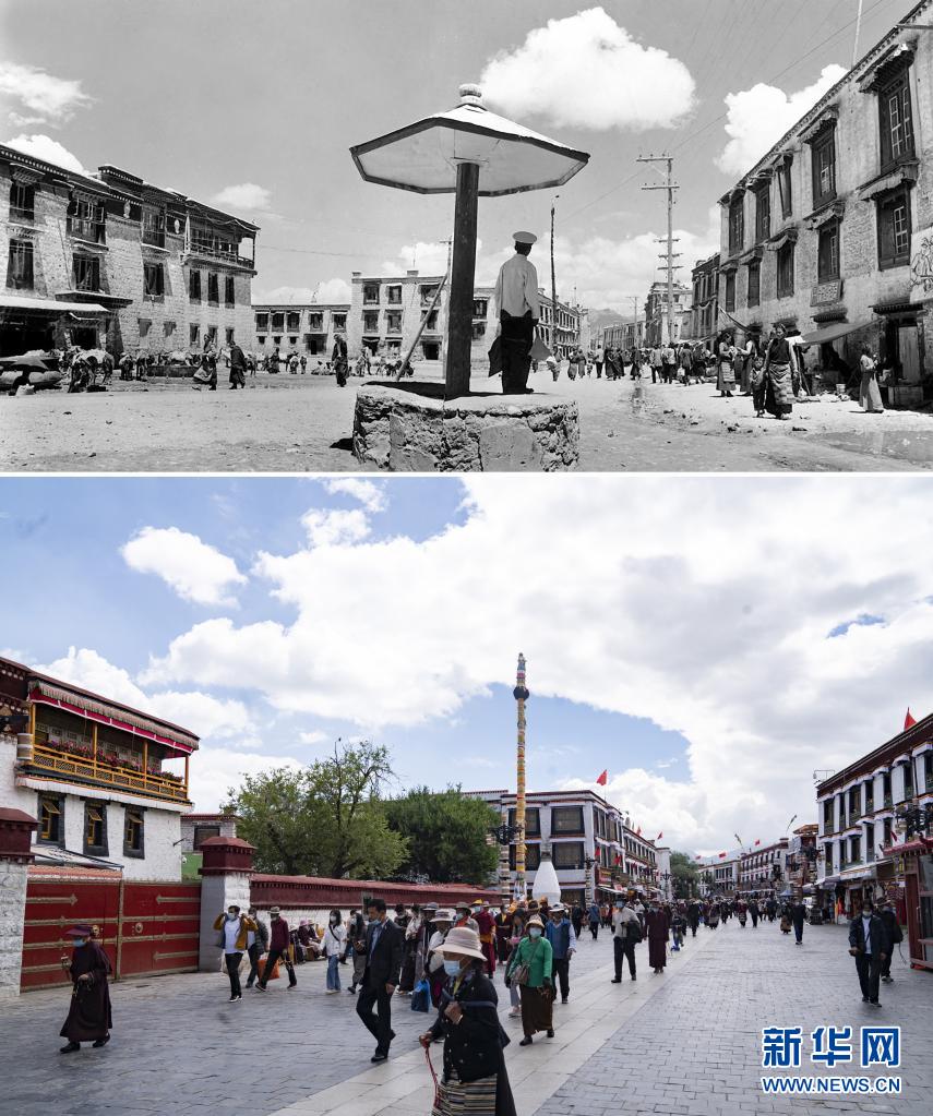 拼版照片:上圖是20世紀(jì)50年代的拉薩市八廓街(新華社記者王純德攝);下圖是2021年8月13日拍攝的拉薩市八廓街(新華社記者覺(jué)果攝)。新華社發(fā)