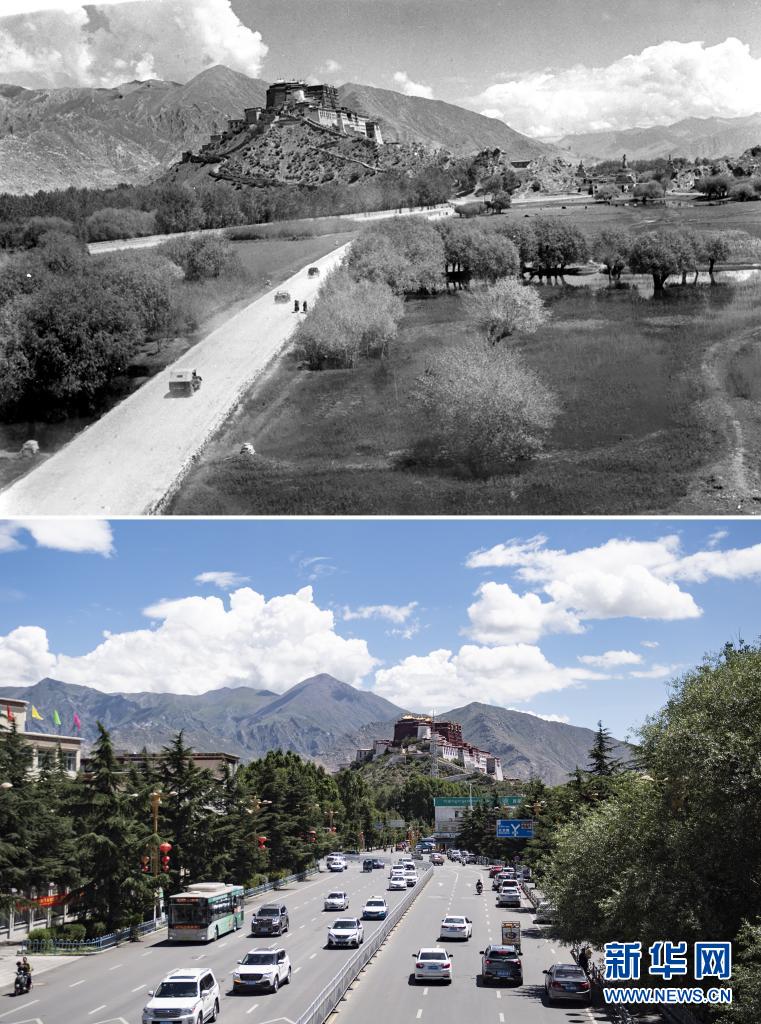 拼版照片:上圖是20世紀(jì)50年代,汽車(chē)通過(guò)市郊公路開(kāi)往布達(dá)拉宮方向(新華社記者任用昭攝);下圖是2021年8月9日,車(chē)輛穿行在通往布達(dá)拉宮的大路上(新華社記者張汝鋒攝)。新華社發(fā)