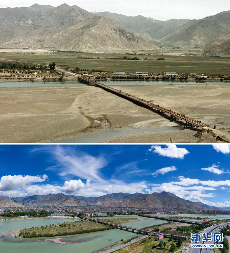拼版照片:上圖是20世紀(jì)50年代的拉薩大橋(新華社記者王純德攝);下圖是2021年8月9日拍攝的拉薩大橋新貌(新華社記者孫非攝,無(wú)人機(jī)照片)。新華社發(fā)