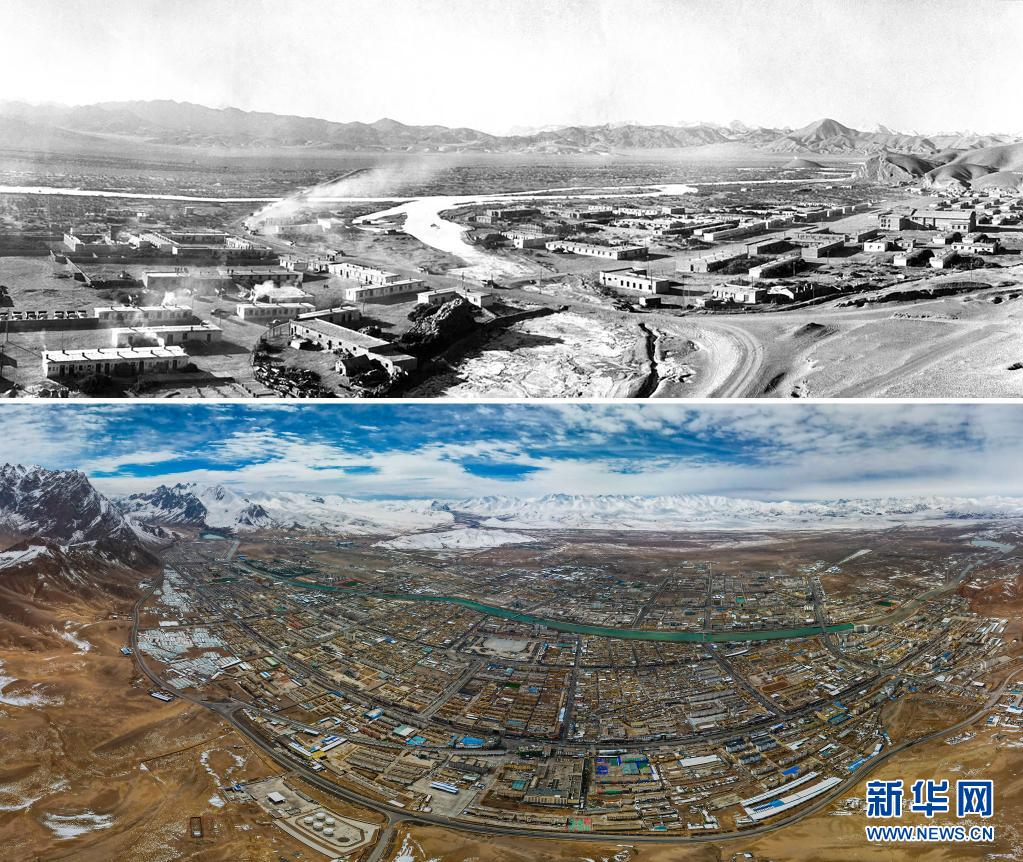 拼版照片:左圖是20世紀(jì)60年代的昌都市區(qū)一角(新華社記者任用昭攝);右圖是2021年3月25日拍攝的昌都市卡若區(qū)(新華社記者孫非攝,無(wú)人機(jī)照片)。新華社發(fā)