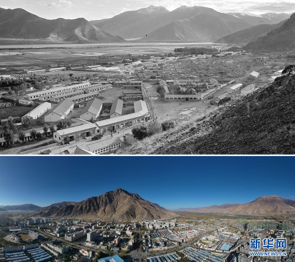 拼版照片:上圖是20世紀(jì)70年代的西藏山南地區(qū)澤當(dāng)鎮(zhèn)景象(新華社記者顧綬康攝);下圖是2020年11月26日拍攝的山南澤當(dāng)鎮(zhèn)風(fēng)貌(新華社發(fā) 次仁龍布攝,無(wú)人機(jī)照片)。新華社發(fā)