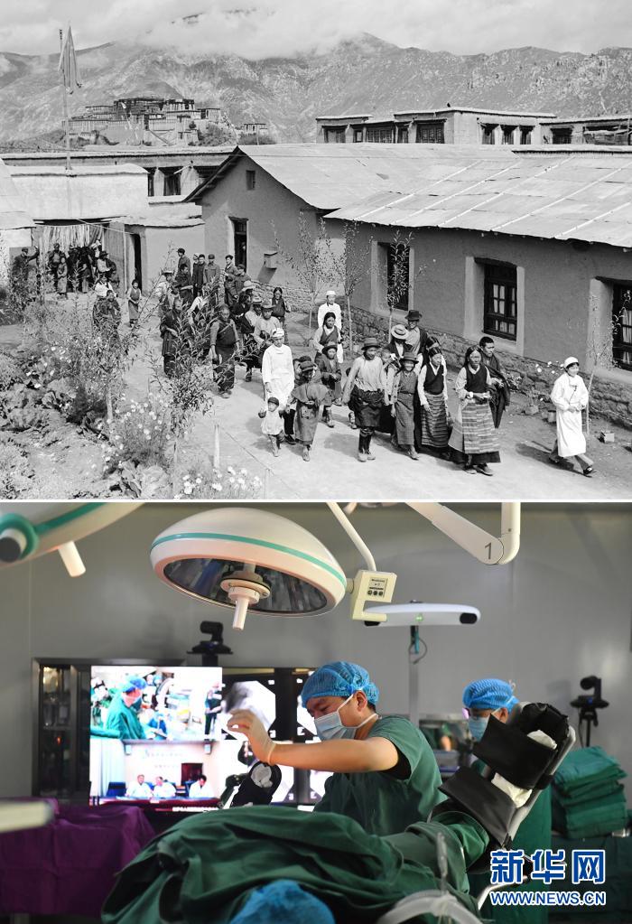 拼版照片:上圖是20世紀(jì)50年代,前往拉薩市人民醫(yī)院看病的藏族群眾在護(hù)士陪同下到醫(yī)療室去就診(新華社記者任用昭攝);下圖是2021年4月19日,拉薩市人民醫(yī)院骨科醫(yī)生通過(guò)5G通信技術(shù),在北京積水潭醫(yī)院專家遠(yuǎn)程指導(dǎo)下使用骨科機(jī)器人開(kāi)展手術(shù)(新華社記者孫瑞博攝)。新華社發(fā)