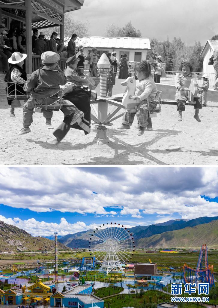 拼版照片:上圖是20世紀(jì)80年代,日喀則幼兒園的孩子們?cè)谕鎰?dòng)物圓盤(pán)轉(zhuǎn)椅(新華社記者程曦?cái)z);下圖是2021年8月9日拍攝的拉薩市象雄美朵游樂(lè)園(新華社記者張汝鋒攝,無(wú)人機(jī)照片)。新華社發(fā)