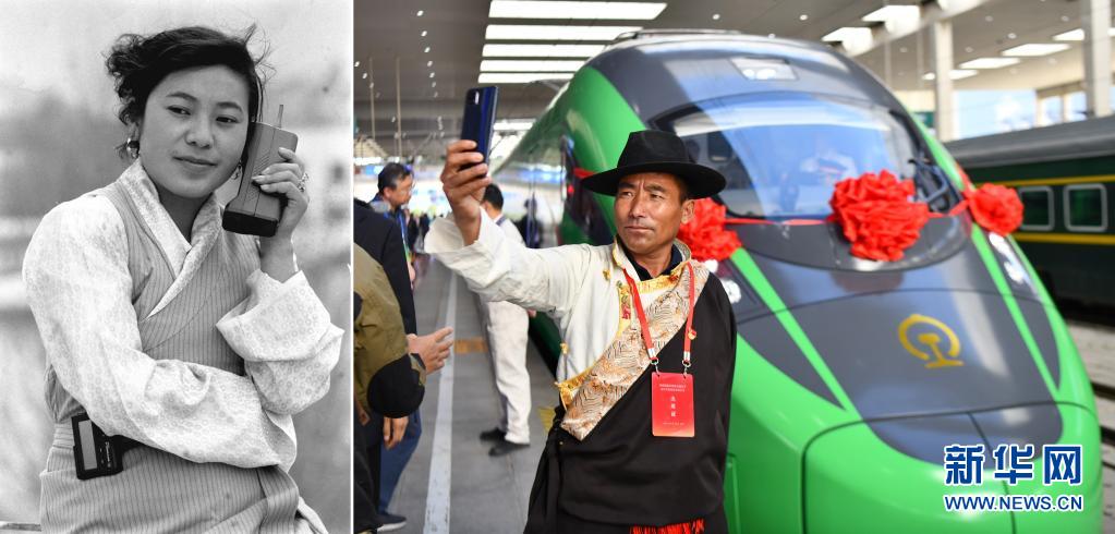 拼版照片:左圖是1994年,腰掛BP機(jī)、手持“大哥大”的藏族女商人拉珍和四川的客戶洽談生意(新華社記者土登攝);右圖是2021年6月25日,乘客與西藏首條電氣化鐵路拉林鐵路上的復(fù)興號(hào)列車(chē)自拍合影(新華社記者晉美多吉攝)。新華社發(fā)