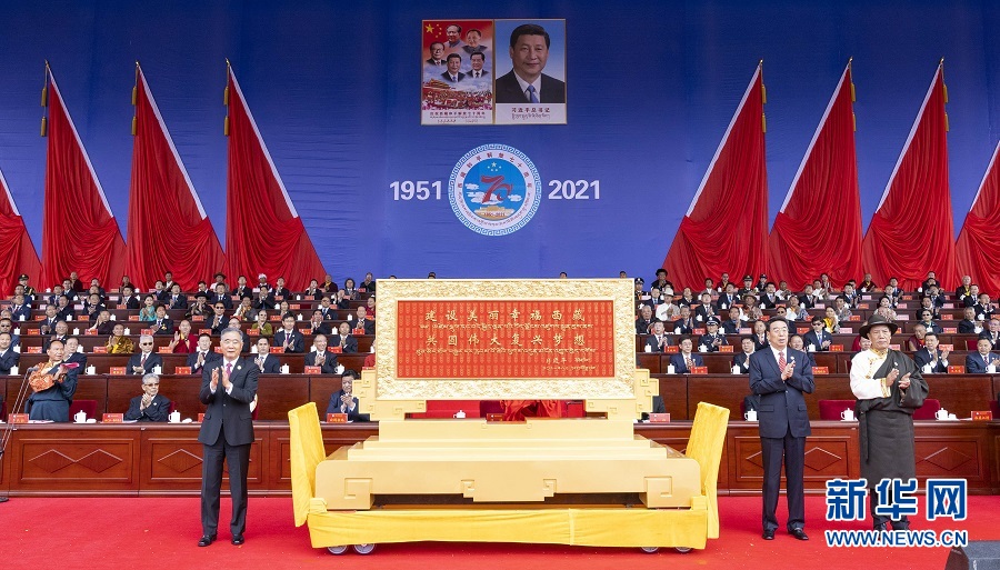8月19日,慶祝西藏和平解放70周年大會在拉薩隆重舉行。中共中央政治局常委、全國政協(xié)主席、中央代表團(tuán)團(tuán)長汪洋向西藏自治區(qū)、西藏軍區(qū)、武警西藏總隊(duì)、西藏自治區(qū)政法系統(tǒng)、中國佛協(xié)西藏分會分別贈送了中共中央總書記、國家主席、中央軍委主席習(xí)近平題詞的“建設(shè)美麗幸福西藏 共圓偉大復(fù)興夢想”賀匾和賀幛。新華社記者 黃敬文 攝