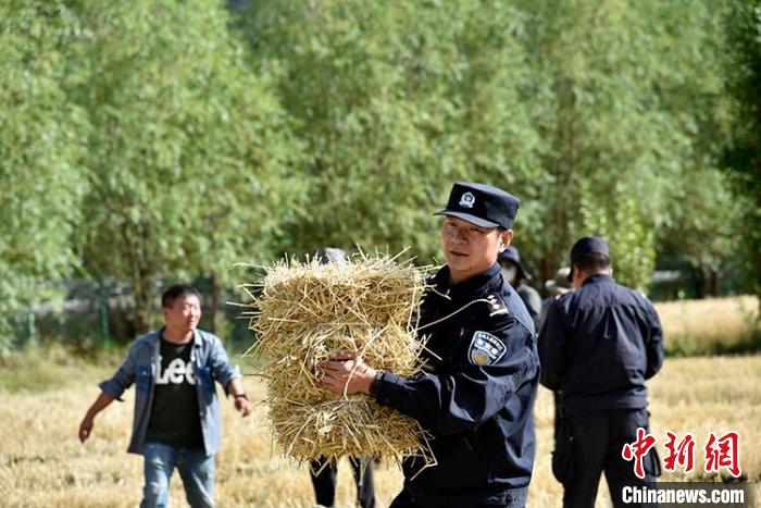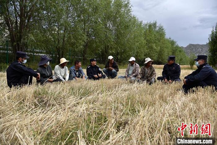 一陣忙碌過后,大家圍攏在田里聊變化說發(fā)展。慶祝西藏和平解放70周年大會剛剛舉行,大家聊著現(xiàn)場觀禮、收聽收看的感受。參加現(xiàn)場大會的民警高揚向大家分享現(xiàn)場感受,講述自己在西藏生活學(xué)習(xí)工作22年的發(fā)展變化和入警初心。歡聲笑語過后,大家又忙碌起來。田間地頭藏青藍(lán)的身影,與金黃麥地構(gòu)成一幅加強民族團結(jié)、警民魚水情深的動人畫卷。