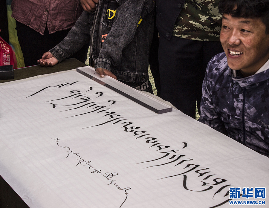 9月23日,群眾在活動(dòng)現(xiàn)場(chǎng)觀賞藏文書(shū)法。新華網(wǎng) 達(dá)次 攝