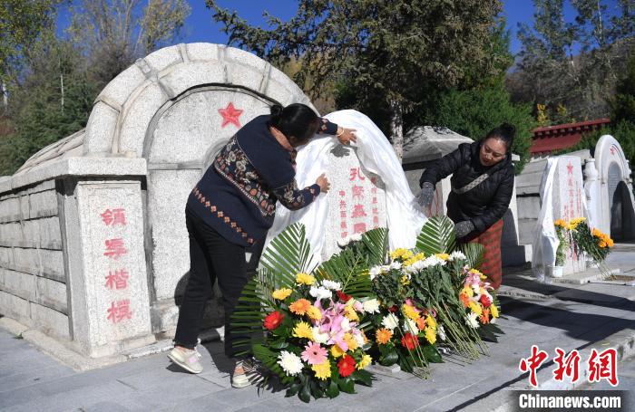 圖為9月30日,在西藏自治區(qū)拉薩市烈士陵園,群眾向孔繁森墓碑敬獻(xiàn)鮮花、哈達(dá)。貢嘎來松 攝