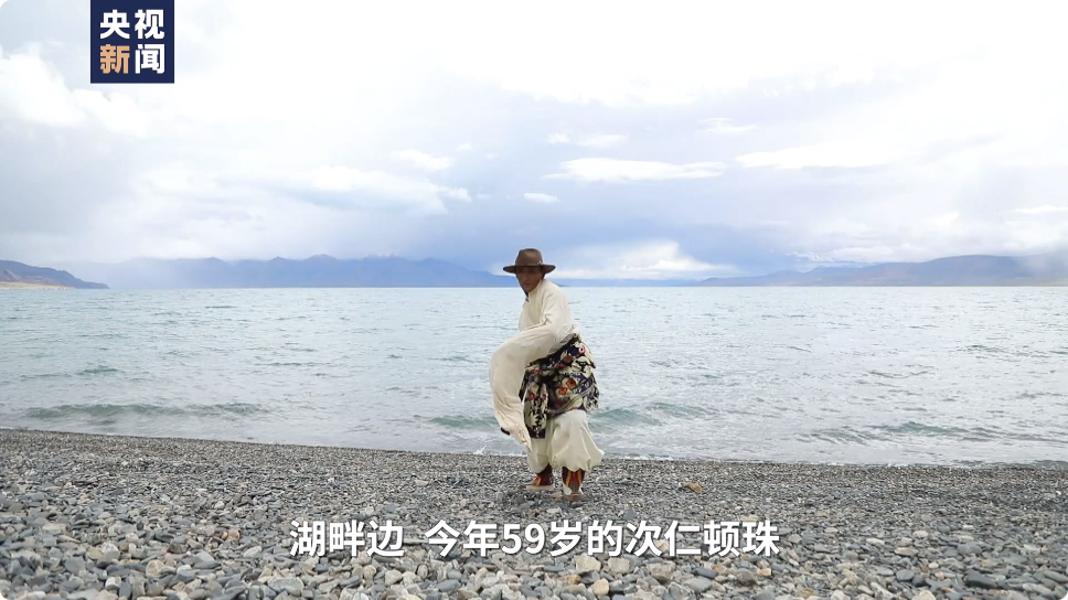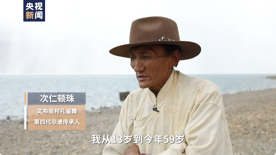 湖畔邊,今年59歲的次仁頓珠,穿著傳統(tǒng)的服飾,甩起長(zhǎng)長(zhǎng)的白袖,跳起了從先輩那里傳承下來(lái)的孔雀舞。