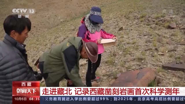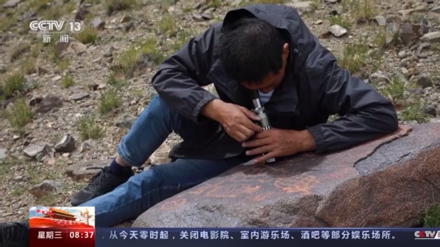 總臺記者 陳琴:現(xiàn)在我們是跟隨科考隊員來到了海拔4700米的加林山巖畫這么一個分布區(qū)域,這里的位置就是在尼瑪縣榮瑪鄉(xiāng)依布茶卡鹽湖的旁邊,我們看見科考隊員正在對這幅巖畫進行登記和記錄。