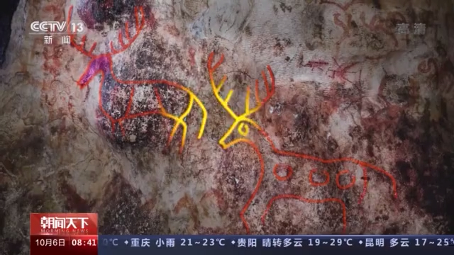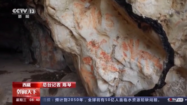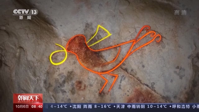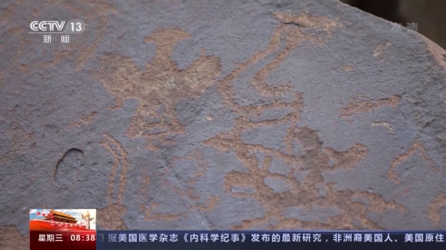 總臺記者 陳琴:現(xiàn)在我們就來到納木錯環(huán)湖科考巖畫調(diào)查點的1號點,您看到這個巖畫是由紅色的赭石這個顏料做成的,看起來特別像一只可愛的小鳥。