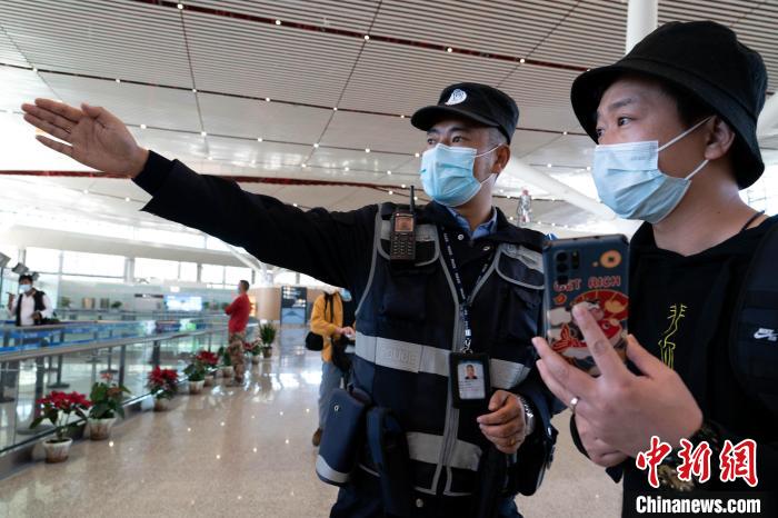 圖為機(jī)場安保人員為旅客提供服務(wù)。程征宇 攝