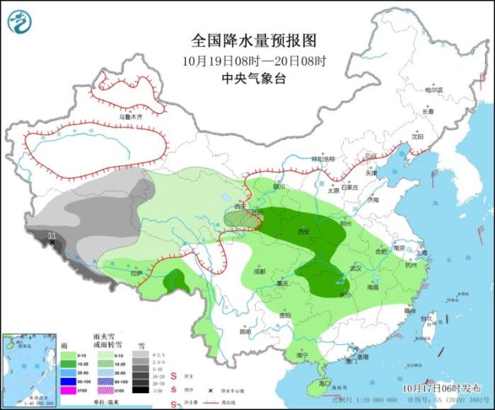 10月19日08時(shí)至20日08時(shí),新疆東南部、西藏中西部、青海西部等地部分地區(qū)有小到中雪,其中,西藏西南部部分地區(qū)有大到暴雪(10~11毫米)。西藏東南部、甘肅南部、陜西中南部、山西南部、河南西南部、湖北西部、湖南北部等地部分地區(qū)有中雨(見(jiàn)圖3)。
