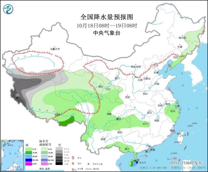 10月17日08時(shí)至18日08時(shí),內(nèi)蒙古東北部、新疆南疆西部山區(qū)等地部分地區(qū)有小到中雪,其中,西藏西部等地部分地區(qū)有大雪(5~7毫米)。海南島等地部分地區(qū)有中到大雨,其中,海南島東南部等地部分地區(qū)有暴雨(50~80毫米)。內(nèi)蒙古中部、西藏北部等地部分地區(qū)有4~5級(jí)風(fēng)(見(jiàn)圖1)。