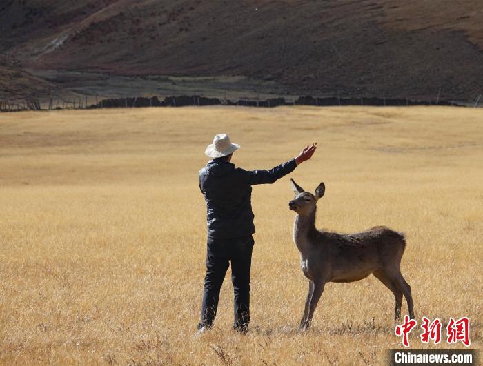 圖為西藏類烏齊馬鹿國家級自然保護區(qū)的管護員正在飼喂馬鹿。冉文娟 攝
