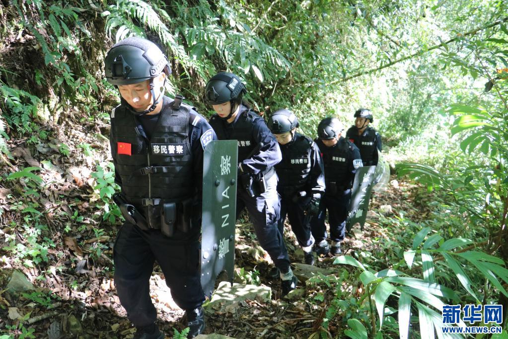 走在隊(duì)伍最前面的是教導(dǎo)員李永杰,他手拿一把砍刀,一邊清理小路兩側(cè)蔓延出來的枝丫,一邊時(shí)刻關(guān)注身后其他人員的情況。隨著海拔升高,陽光從郁郁蔥蔥的樹葉間撒下縷縷光芒,2名女民警艱難穿行期間,謹(jǐn)慎觀察著周圍情況后前行。