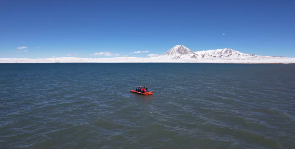 風(fēng)浪中,橡膠艇駛進(jìn)雀莫錯(cuò)湖心。小小的橡膠艇非常簡(jiǎn)陋狹窄,三位中科院專家和我們兩名記者共五人擠著坐在船沿上,腳都伸展不開。暈船,風(fēng)浪這些全都顧不得了。我一只手拿著麥克,一只手緊緊攥住橡膠艇的邊緣,抓緊一切時(shí)間采訪。