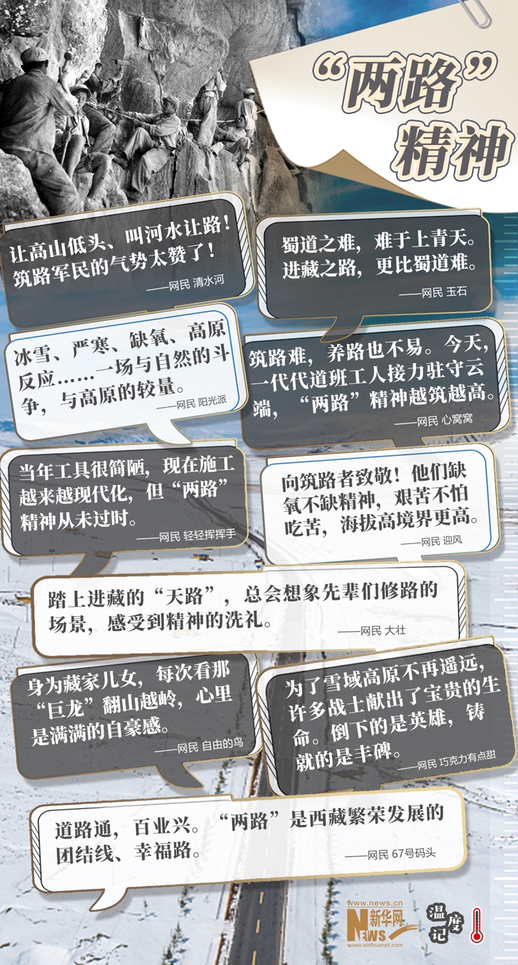 “天路”巍峨,精神閃光。當(dāng)雪域高原換了人間,新一代建設(shè)者正接過接力棒,在新時代續(xù)寫著新的傳奇?!敖裉欤淮腊喙と私恿︸v守云端,‘兩路’精神越筑越高”,正如網(wǎng)民所說,無論過去、現(xiàn)在和將來,“兩路”精神都是西藏各族人民建設(shè)幸福家園的力量源泉和精神動力,也必將激勵中華兒女為了更加美好的明天繼續(xù)奮斗、前行。(文字:馬若虎 海報設(shè)計:王曄)