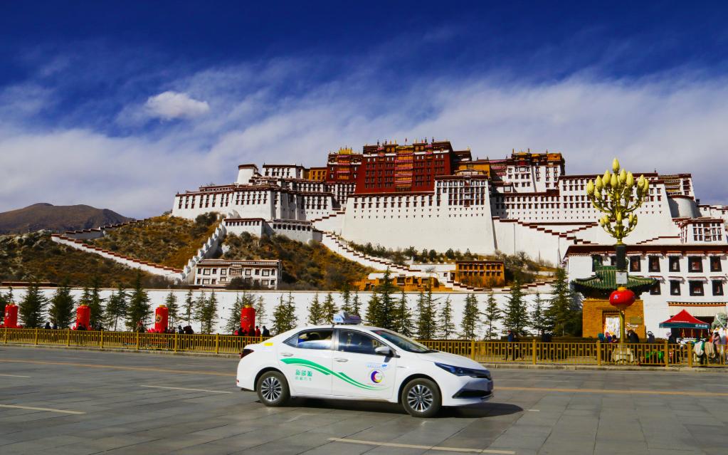 新能源出租車從布達(dá)拉宮廣場(chǎng)前駛過(guò)(2018年2月11日攝)。 新華社發(fā) 央梅朵 攝
