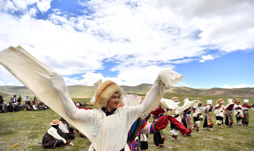 西藏班戈縣青龍鄉(xiāng)牧民在草原上跳舞(2021年7月15日攝)。 新華社記者 覺(jué)果 攝