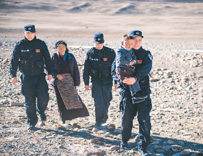 普瑪江塘邊境派出所坐落于此,派出所的移民管理警察守護著轄區(qū)內的祖國領土。民警們常在中國和不丹的邊境地區(qū)巡邏,那里冰川密布,碎石路下往往暗藏冰裂縫。巡邏途中,民警們會熱心幫助前來求助的牧民群眾?!班l(xiāng)親們有困難總是會想到我們?!泵窬⑼酱胝f。