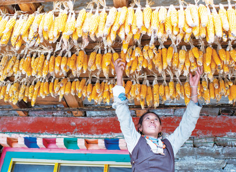 陳塘鎮(zhèn)夏爾巴人尼瑪在整理玉米(11月25日攝)。 普布扎西、格桑邊覺、孫瑞博攝