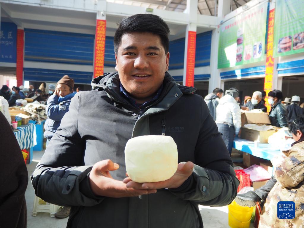 康松旺堆捧著自家制作的酥油。(2021年12月10日攝) 新華社記者 金一清 攝