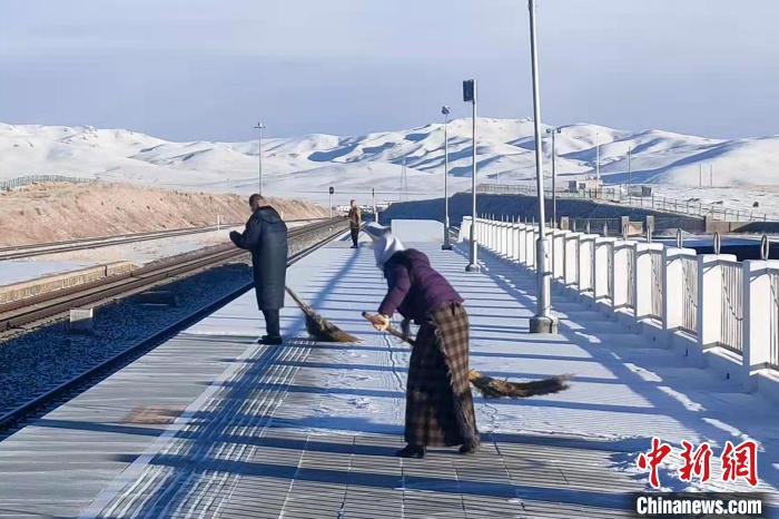 工作人員在海拔4500多米的那曲火車站清掃積雪。王志先 攝