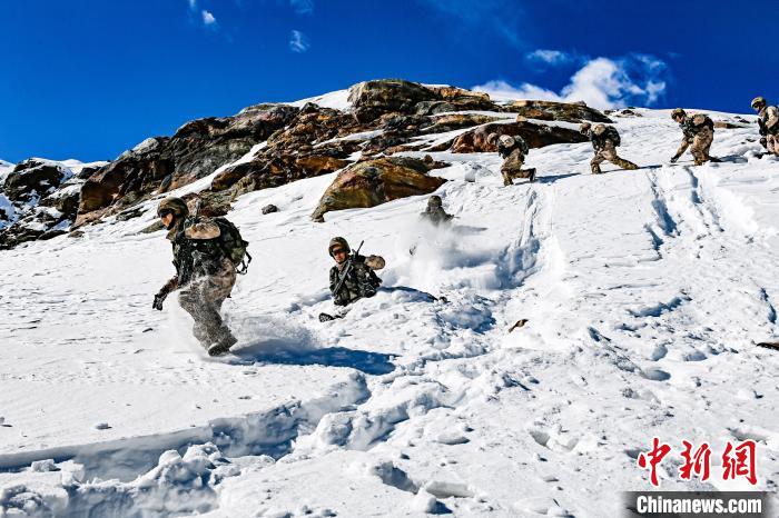 巡邏途中,官兵們順雪坡滑下,節(jié)省時(shí)間。 王江 攝