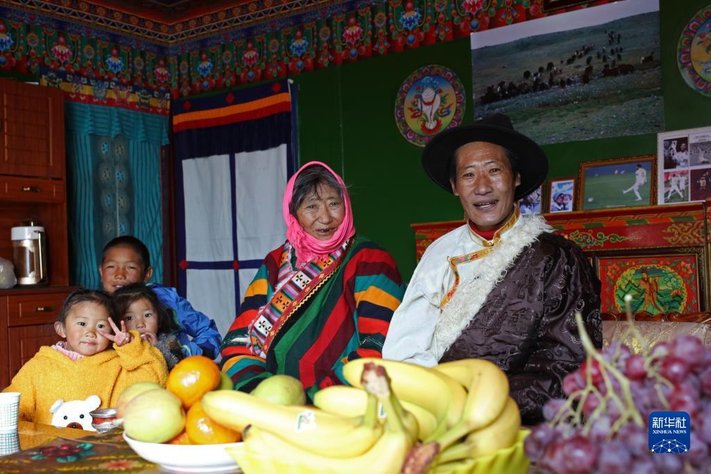 搬遷牧民仁增(右一)一家為藏歷新年購(gòu)買了很多新鮮水果,他的小女兒古榮卓瑪(左一)是搬遷點(diǎn)第一個(gè)出生的孩子(2月28日攝)。新華社記者 姜帆 攝