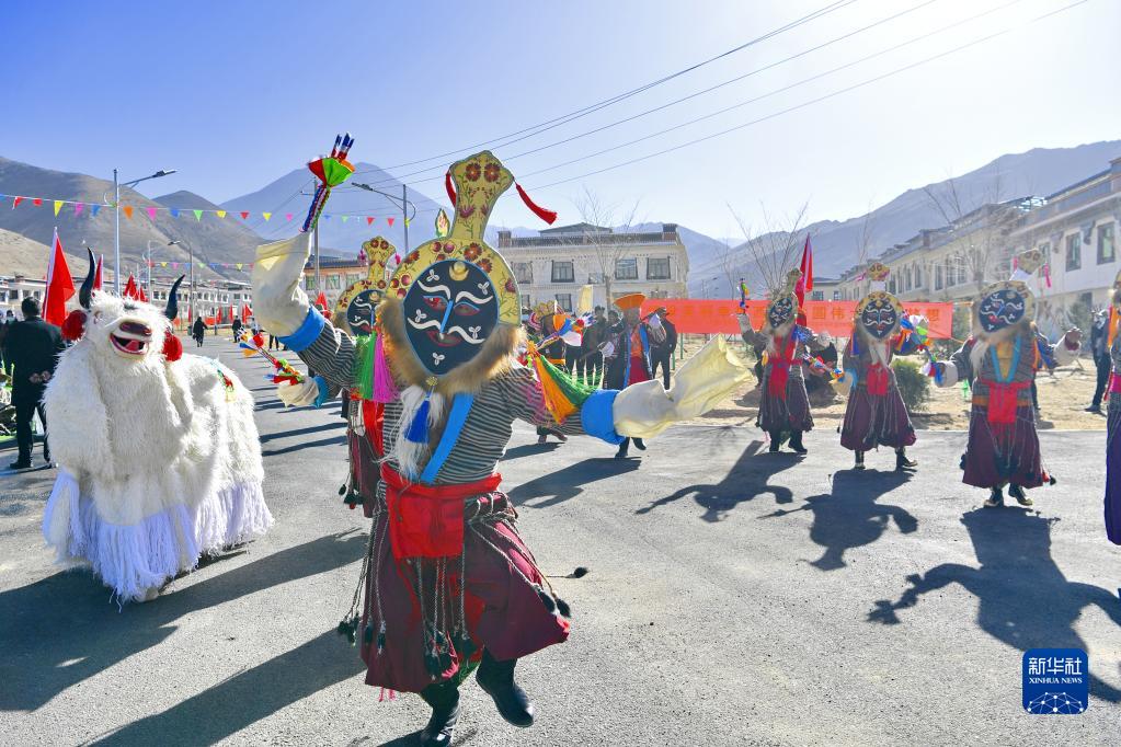 3月28日,南木林縣卡孜鄉(xiāng)群眾在湘河水庫(kù)移民新村表演藏戲。新華社記者 張汝鋒 攝