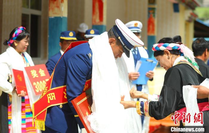 圖為村民為巴桑旺堆獻上哈達。西繞拉翁 攝
