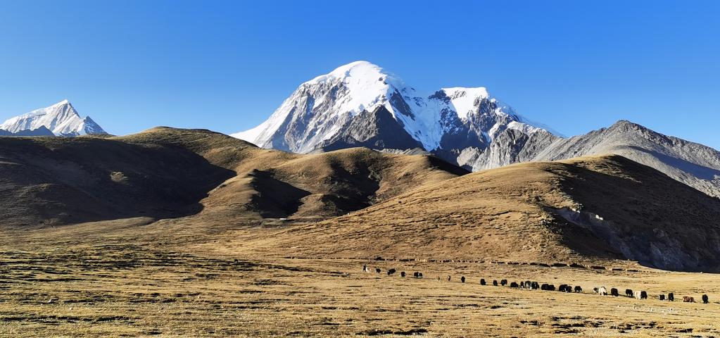 從平緩的草地步入山谷,溪水流下,冰湖上的山峰倒影如夢幻般美麗。目之所及,除了零星經(jīng)過的巖羊和雪雞,唯有肅穆雄偉的山峰;耳之所聞,除了偶爾傳來的冰川融化的碎裂聲外,只余亙古不變常伴耳畔的風聲。