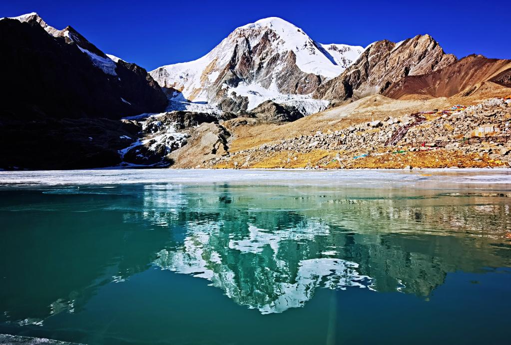 2022年3月27日拍攝的窮母崗日峰在冰湖上的倒影。(手機照片,新華社記者 沈虹冰 攝)