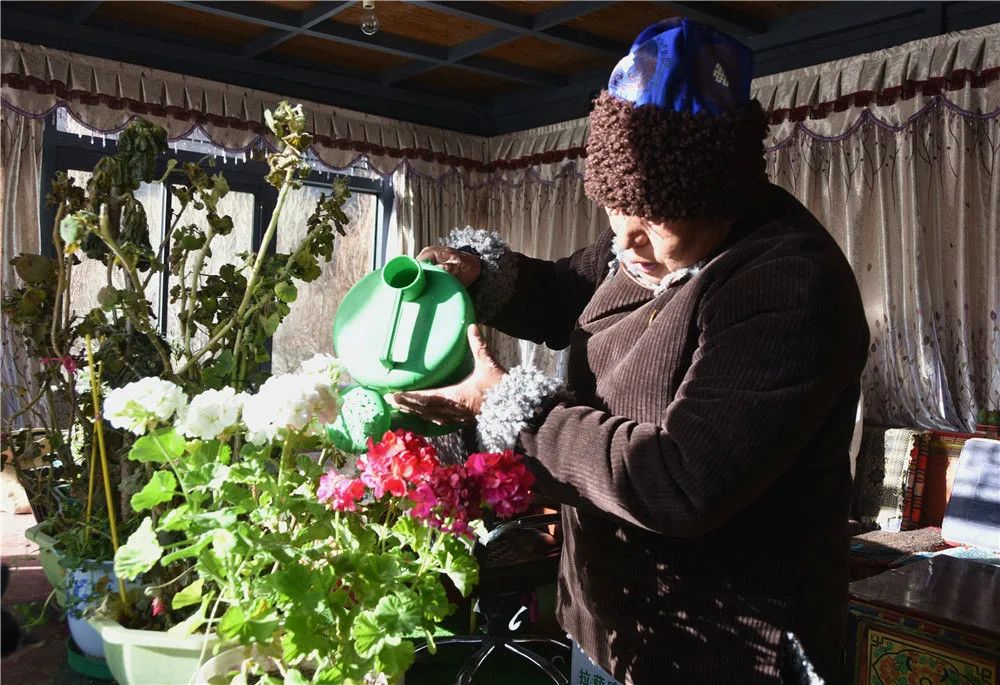 西藏洛扎縣嘎波社區(qū)扎麥村村民達(dá)瓦次仁在給陽(yáng)光房里的盆栽澆水(1月19日攝)。新華社記者 陳尚才 攝