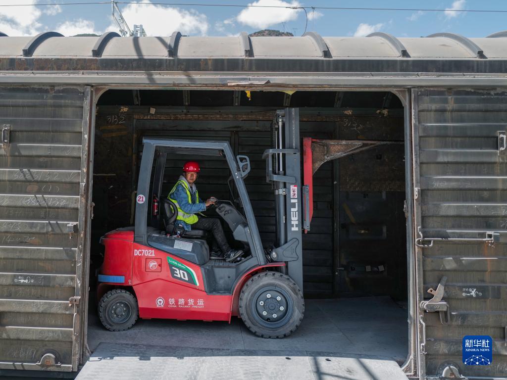 林芝市巴宜區(qū)布久鄉(xiāng)朵當(dāng)村村民邊巴在林芝站貨場駕駛叉車(3月29日攝)。新華社記者 洛卓嘉措 攝