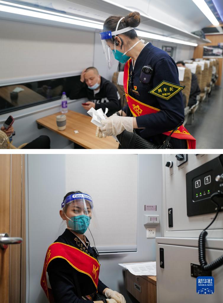 拼版照片:上圖為3月27日,劉文靜在列車上檢查衛(wèi)生;下圖為劉文靜在列車廣播室。C893次列車長劉文靜已經(jīng)在鐵路工作近十年,先后在青藏、拉日、拉林三條鐵路線任職,親身經(jīng)歷十年來西藏鐵路運(yùn)輸?shù)木拮?。新華社記者 洛卓嘉措 攝