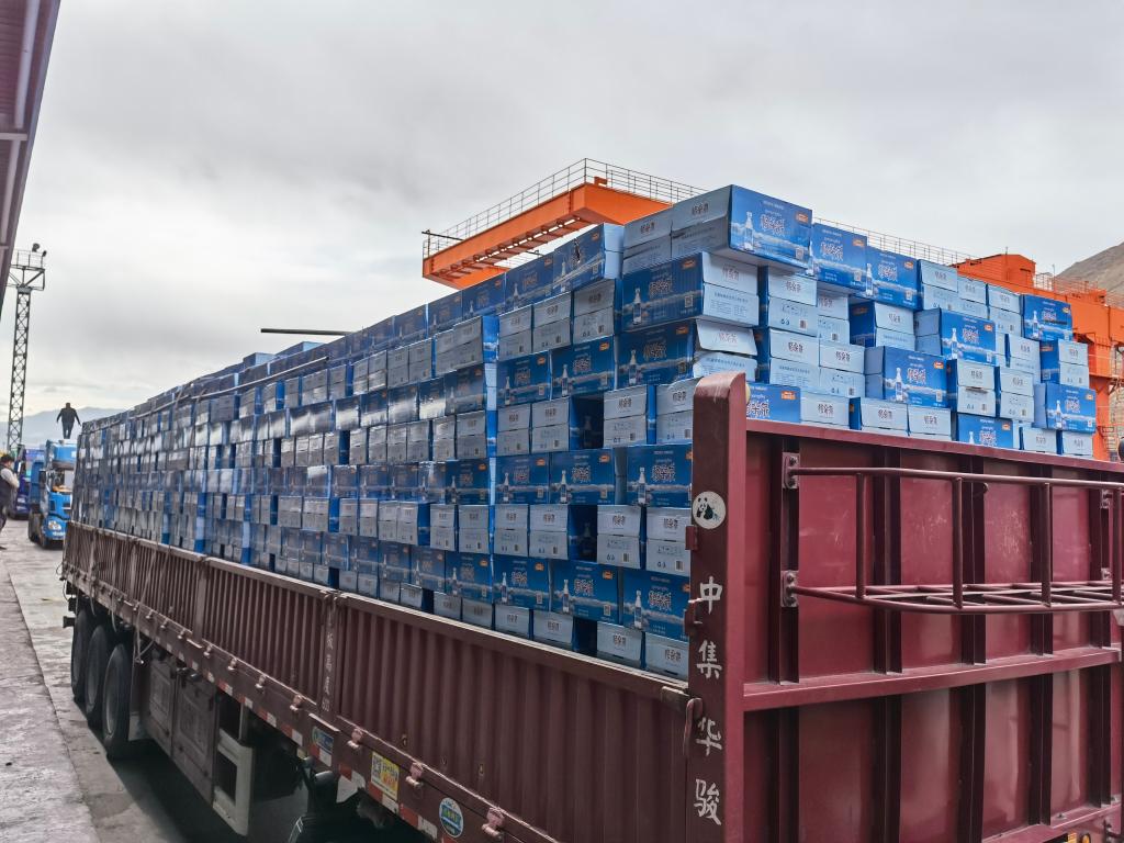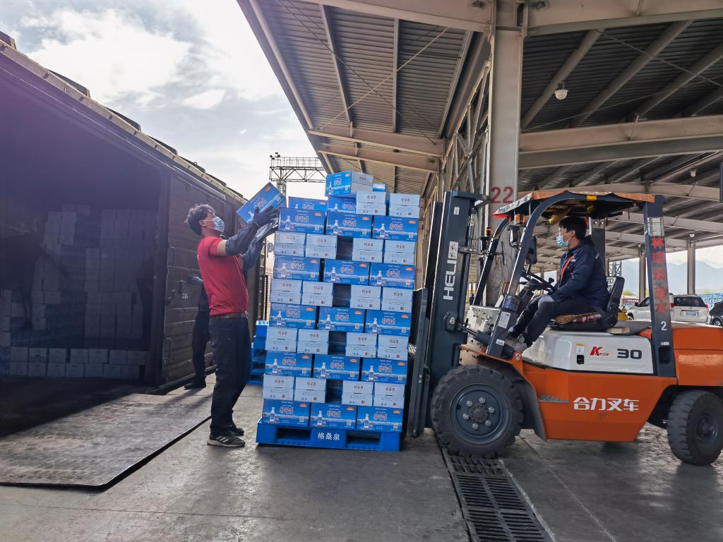 4月10日,運(yùn)輸?shù)嚼_西站的天然飲用水正等待卸貨裝運(yùn)。新華社記者 劉洪明 攝