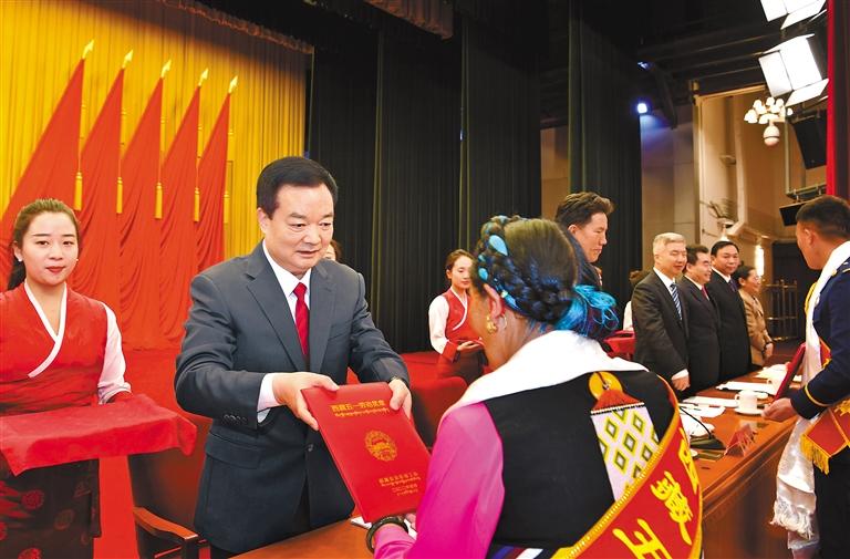 4月29日上午,西藏自治區(qū)慶祝“五一”國際勞動節(jié)暨表彰大會在拉薩舉行。自治區(qū)黨委書記王君正出席會議并講話。這是王君正為受表彰代表頒獎。記者 旦增西旦 攝