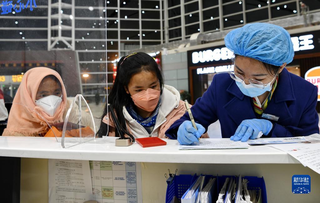 5月8日,在拉薩貢嘎機場候機樓,機場服務人員(右)為患兒和家人登記信息。新華社記者 張汝鋒 攝
