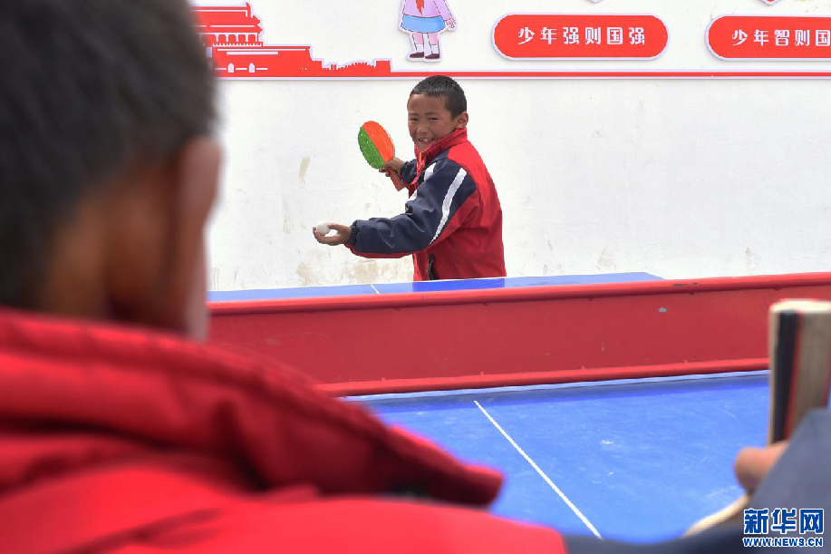 多油村中心小學(xué)的學(xué)生在課余時(shí)間玩乒乓球(4月21日攝)。新華網(wǎng) 旦增努布攝