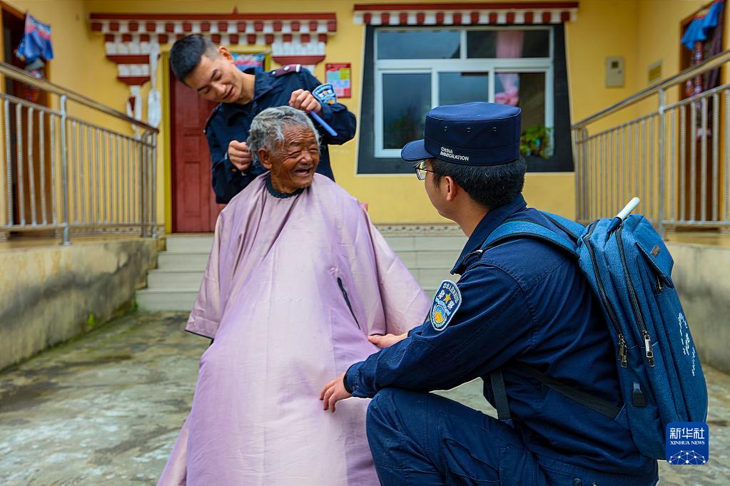“阿嗚(察隅縣方言、老者的尊稱),扎扎(理發(fā))!”定期走訪中,“背包民警”除了給竹巴村孤寡老人多多送生活必需品,還為他理發(fā)?!袄先硕洳惶?,剪頭發(fā)時經(jīng)常動來動去,我們就耐心陪老人聊天,現(xiàn)在越來越熟了還經(jīng)常聊家常?!泵窬娋S說。